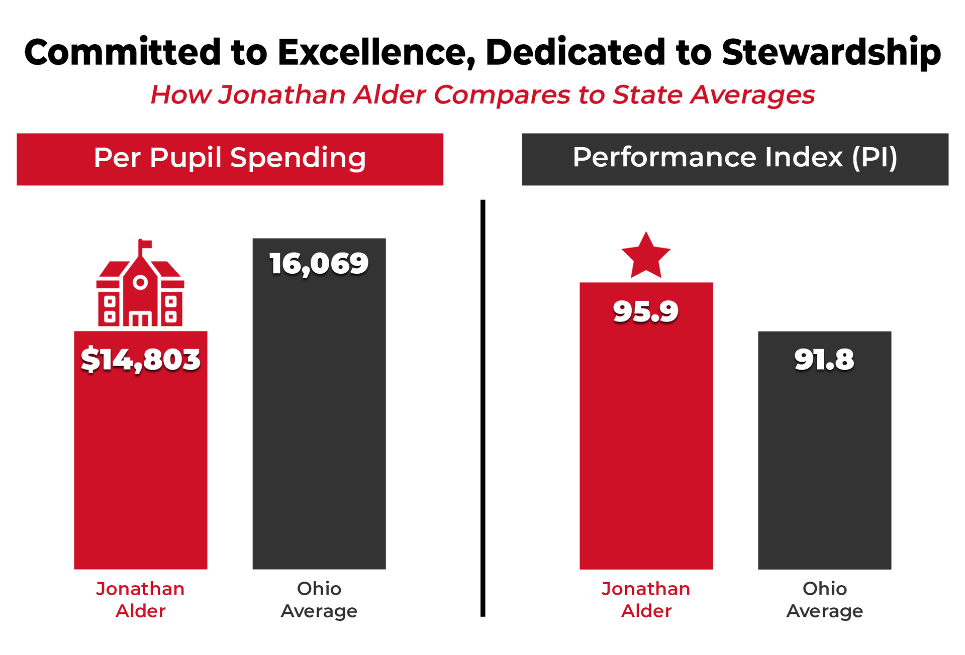 At Jonathan Alder, our community has much to be proud of. We spend approximately $14,803 per student while achieving a Performance Index of 95.9, exceeding the state average in student performance while operating below the state average in per-pupil spending.